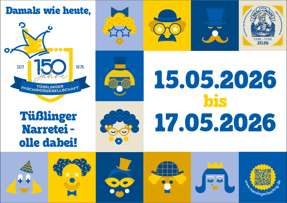 Programm für unser Festwochenende 150 Jahre Tüsslinger Faschingsgesellschaft vom 15.05.2026 bis 17.05.2026.
